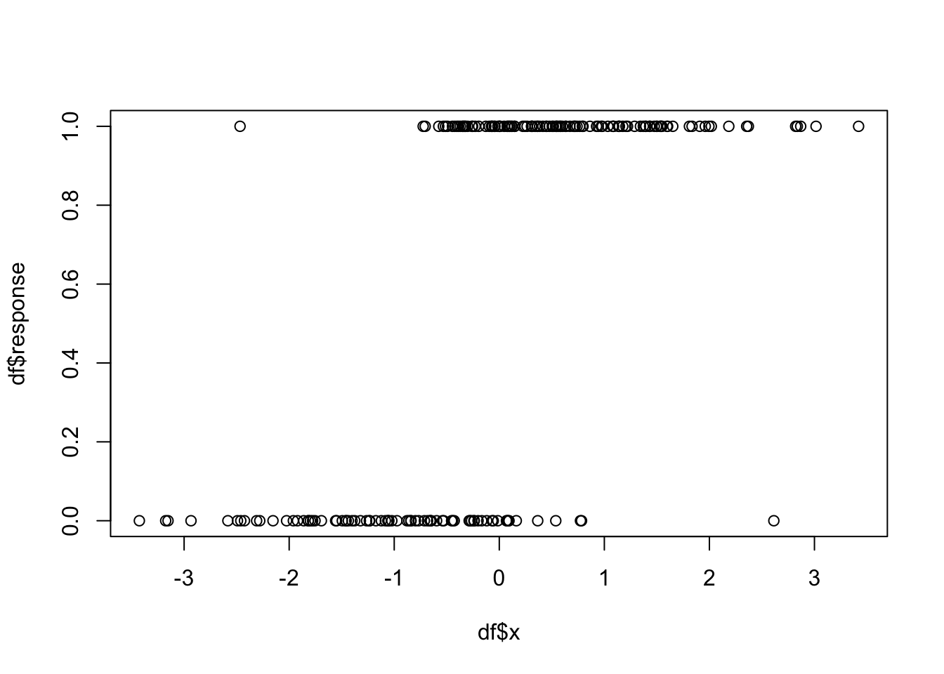 This is a very typical and promising plot for wanting to do logistic regression. We see that as \(x\) gets larger, more of the responses are 1 and as \(x\) gets smaller, more of the responses are 0. We will see later that this synthetic data was generated exactly according to the logistic regression model, much like a response of 1 + 2*x + rnorm(100, 0, 3) would be exactly according to OLS.