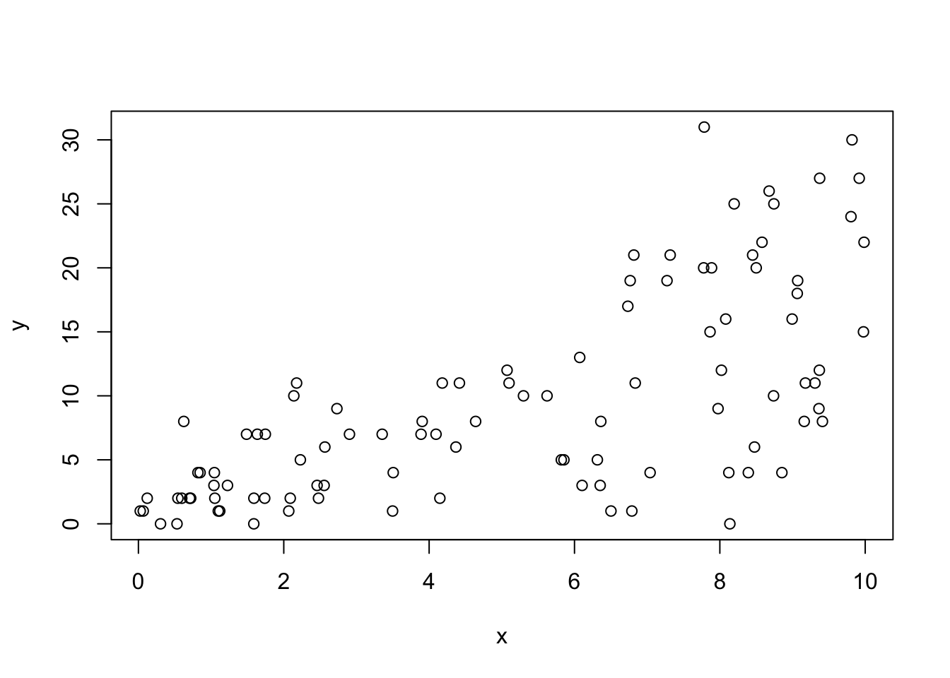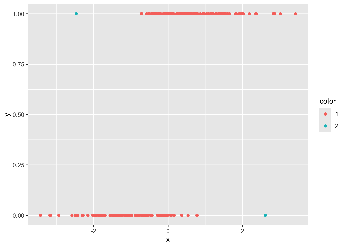 This is a very typical and promising plot for wanting to do logistic regression. We see that as \(x\) gets larger, more of the responses are 1 and as \(x\) gets smaller, more of the responses are 0. We will see later that this synthetic data was generated exactly according to the logistic regression model, much like a response of 1 + 2*x + rnorm(100, 0, 3) would be exactly according to OLS.