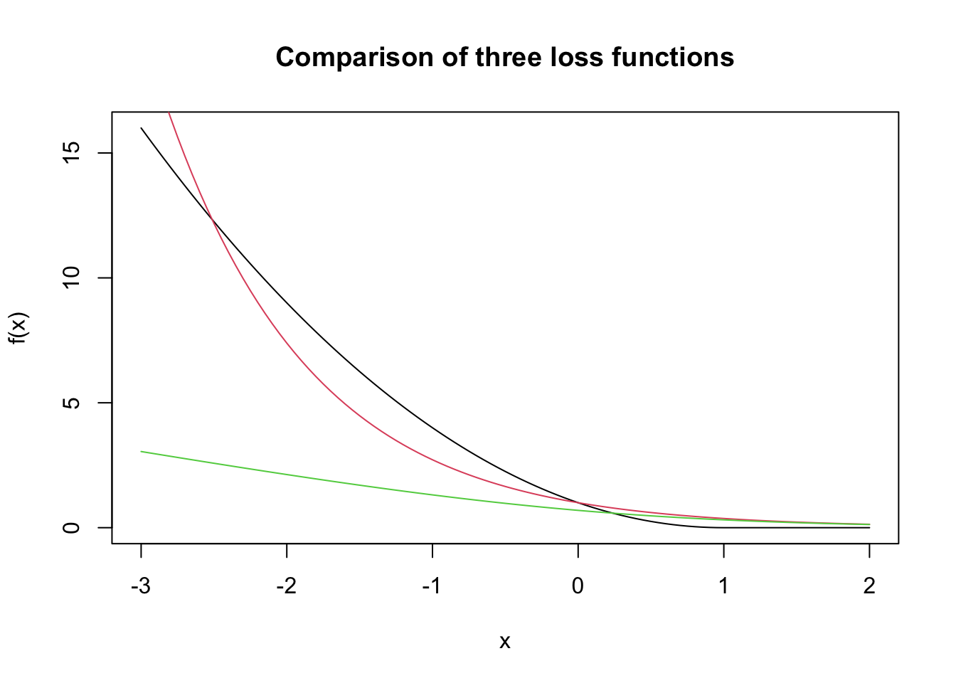 curve(f, from = -3, to = 2, main = "Comparison of three loss functions") #black